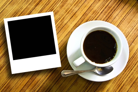 Vintage photo frame with cup of coffee and flowers on wooden table