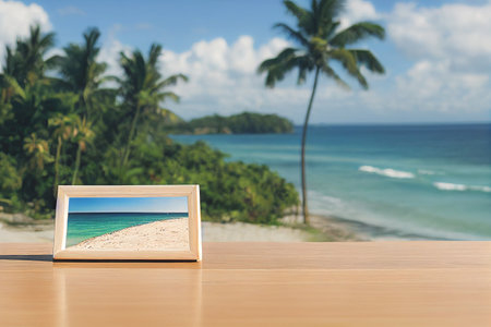 Empty wooden table for product display with view of tropical beach background. 3D illustration