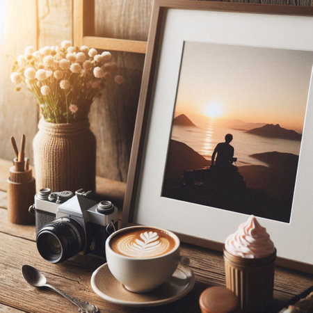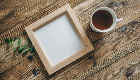 a sleek, modern frame with a soothing coffee color theme sits elegantly on a wooden table, exuding a sense of minimalism and sophistication, perfect for showcasing cherished memories or artistic prints in a cozy, rustic-inspired setting, blending seamlessly with natural wood tones and earthy decor. ai generated