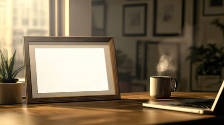 Empty picture frame with a white mat, on a rich brown wooden table, next to a laptop and a steaming coffee mug.