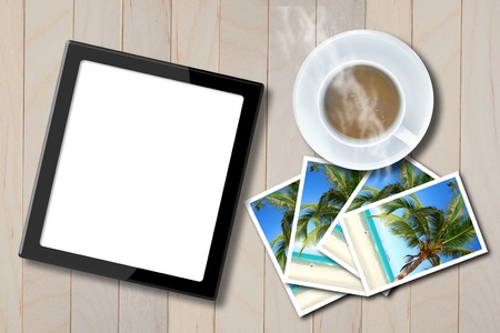 Summer photo album of journey honeymoon trip on wood table. instant photo of vintage camera - vintage and retro style