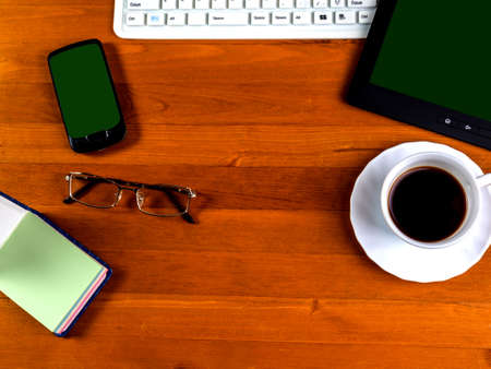cup with coffee, office supplies and gadgets with a green screen. View from above