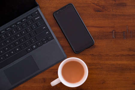 Laptop keyboard with smartphone and a cup of coffee/tea on a rustic wooden table. Modern Office space. Mobile office. Work from home or anywhere comfortable. Working hard!