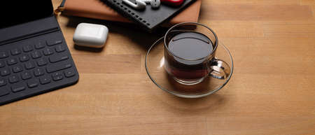 Top view of black cup of coffee on dark office desk with laptop, camera, smartphone, schedule book and copy space