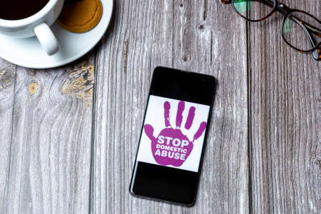 03-10-2021 Portsmouth, Hampshire, UK A Mobile phone or cell phone laid on a wooden table with a Stop domestic abuse on screen