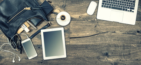 Wooden desk with various gadgets and accessories, top view