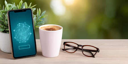 Modern smartphone displays geometric design, positioned next to a pink coffee cup and eyeglasses, with lush greenery in the background, enhancing a stylish workspace