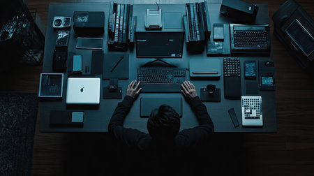 A sleek, minimalist workspace capturing the essence of modern technology and creativity. This image features various tech devices arranged on a dark desktop, ideal for inspiring digital professionals and enhancing productivity.