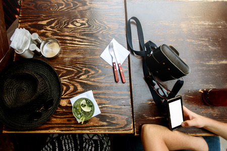 traveler man holding phone with empty screen on wooden table with tasty mojito and photo camera, summer vacation concept