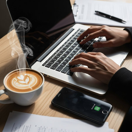 A serene indoor workspace featuring a laptop and a cup of coffee, showcasing a warm ambiance with soft lighting that enhances comfort and productivity.