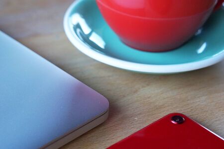 Stylish red coffee cup, phone and laptop on desk table. Black background, business concept, close up