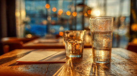 A tranquil scene features pair of glass tumblers filled with clear water resting on aged wood, bathed in soft amber light, with a cozy diner atmosphere and twinkling