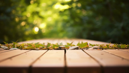 Wooden deck with leaves, blurred green forest background. Peaceful, serene atmosphere.