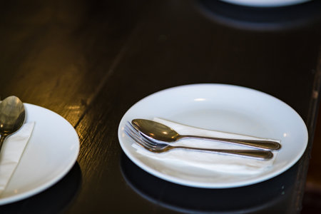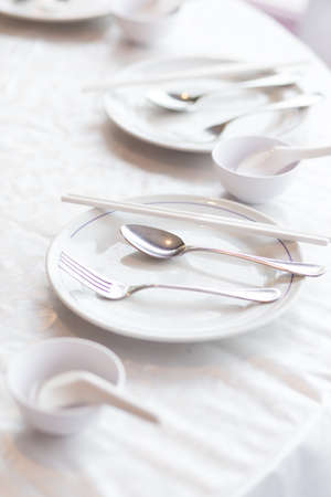 Close up table setting of White plate. Breakfast meal concept.