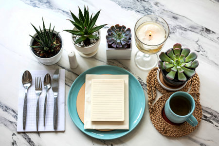 A minimalist table setting features succulents, a candle, a place setting with a blank notepad, and a cup of tea. The scene is calming and sophisticated.