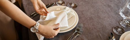 cropped view of woman arranging festive table setting for special occasion in event hall, banner