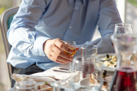 people eating in the restaurant view from above. A restaurant of classic European cuisine. Only peoples hands can be seen