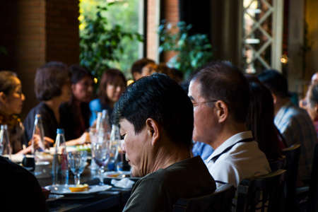 TBILISI, GEORGIA - JULY 14, 2019: Asian tourists eating, sitting and talking in Restoration of Tbilisi. Traditional dishes and national food on the table.