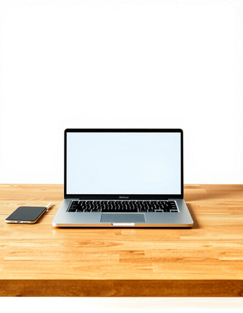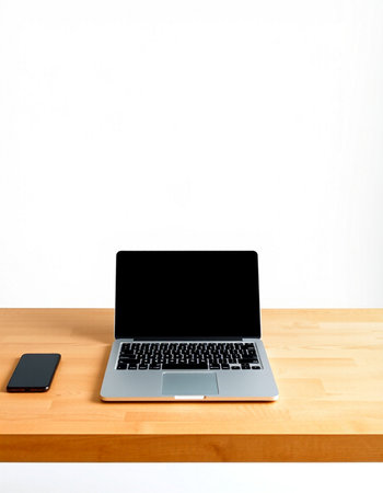 Laptop with blank screen on wooden desk and smartphone on white background
