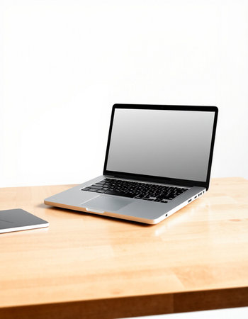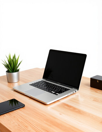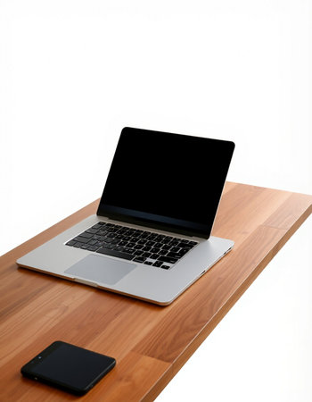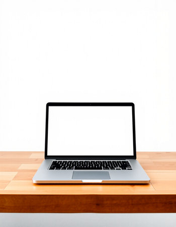 Laptop with blank screen on a wooden desk isolated on white background