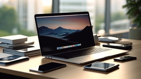 picture of a laptop, digital tablet, and smartphone up close on a desk. Generative AI, modern technologies at the office desk