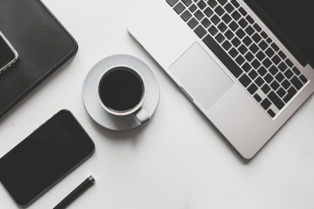 Workplace minimalist flat lay with a laptop, smartphone, coffee cup, and modern accessories in neutral tones. AI generative