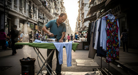 Handsome middle-aged man ironing clothes on ironing board outdoors