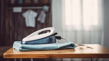 Iron on wooden board with clothes, ironing board household concept. Generative AI