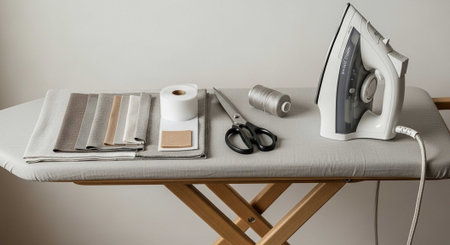 A serene indoor image featuring an iron resting on an ironing board in a sunlit room. Natural elements and warm tones create a cozy atmosphere, perfect for a relaxing day at home.