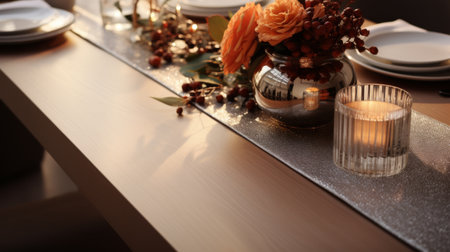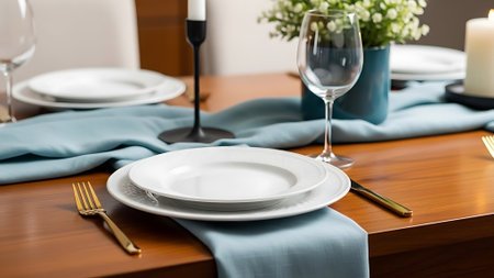 A refined dining table set with plates, glassware, and warm lighting, evoking luxury dining and formal gatherings.