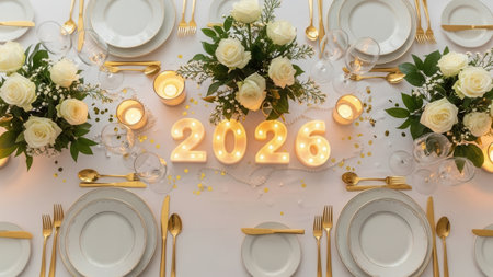 Sophisticated table setting decorated with candles shaped as 2025, white flowers, gold utensils, plates, and glasses ready for a celebration.