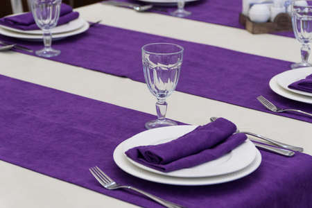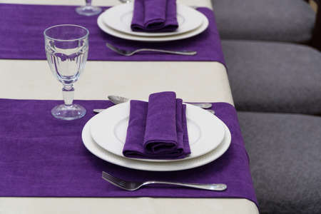 serving banquet table in a luxurious restaurant in purple and white style