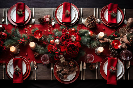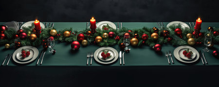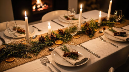 Festive table setting for Christmas and New Year dinner with candles and decorations