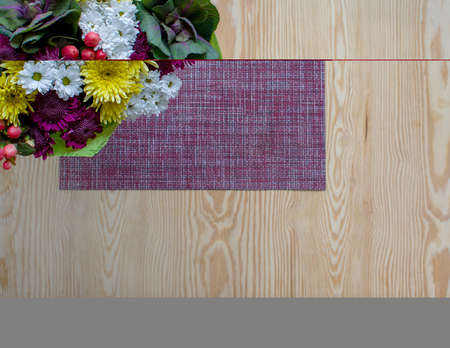 A bouquet of field flowers on a brown wooden background. Different wildflowers. Top view home decoration.