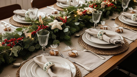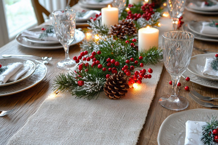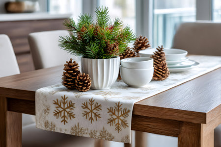 Festive Christmas table setting with pine branches, pine cones and golden snowflakes decorating a table runner