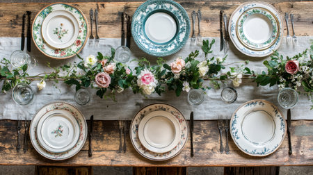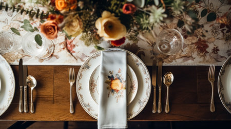 Rustic Dinner Party Table Setting From Above. Generative Ai