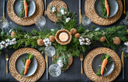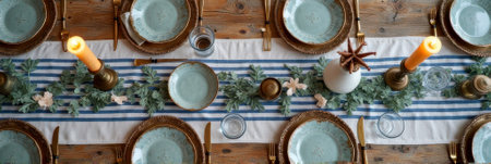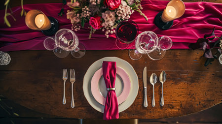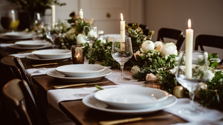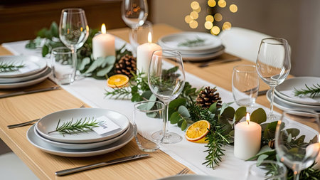 A well-lit, top-down view showcases a table set for a formal event. The composition features white plates, sparkling glassware, and decorative greenery and candles. The scene suggests a sophisticated ambiance, with textures of fabric and wood. Suitable for various editorial and commercial applications.