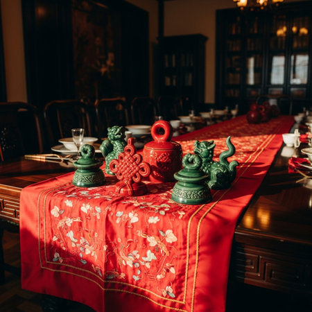 Festive New Year s table with traditional Chinese cuisine featuring salmon, salads and fresh fruits
