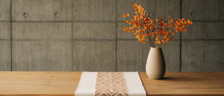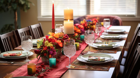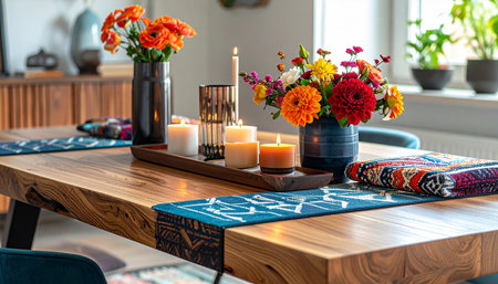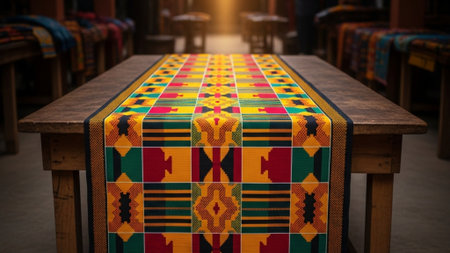 an african styled table runner on a wooden dining table, created with generative ai