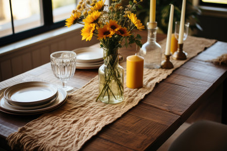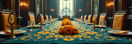 Elegant dining room with ornate table and sunflower tablecloth in grand mansion. That the image is generated using AI.