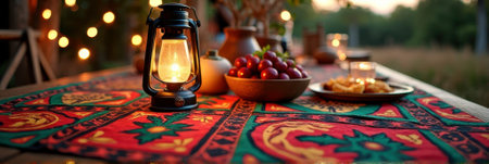 A beautifully arranged table showcases various dishes and fruits, illuminated by soft light in a warm atmosphere, creating an inviting scene for gathering.