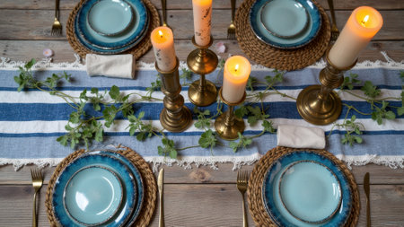 Elegant table setting with blue plates, candles, and woven accents for a cozy dinner.