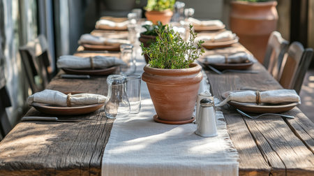 A rustic dining table setup with clay pots, linen napkins, and vintage cutlery on a wooden table.