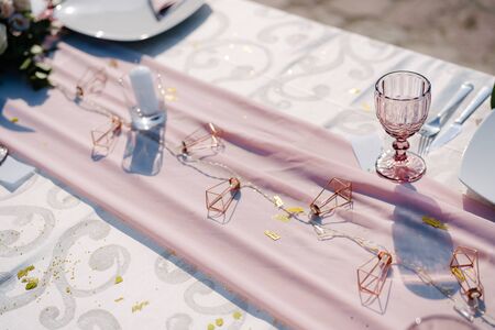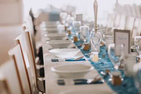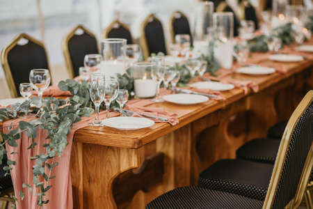 Beautiful wedding decorated table with a white tablecloth