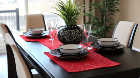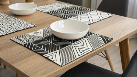 Dining table decorated with stylish placemats and a bowl, showcasing modern interior design trends