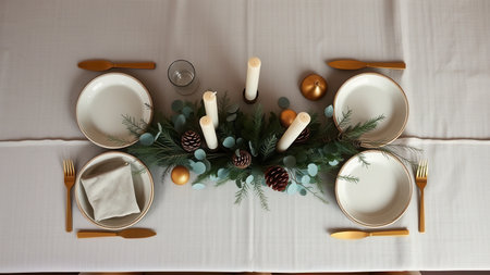 Modern Christmas table setting. A minimalist holiday table setting from above, with eucalyptus, pine, and gold accents on a neutral tablecloth.