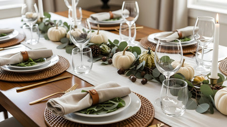 An elegant dining table is set for a fall celebration, featuring white pumpkins, eucalyptus greenery, and tall candles. The neutral tones of the plates and linen napkins on the wooden table create a cozy and sophisticated Thanksgiving atmosphere.