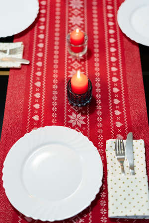 Festive table decoration for the New Year holidays with red candles and white plates on a red cloth tablecloth with themed pattern.