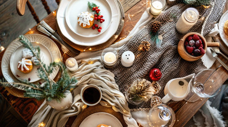 Cozy winter dining table setup with a woolen table runner, warm-toned dishes, and a festive spread of seasonal treats and hot beverages