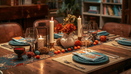 An intimate table setting is decorated with candles, greenery, and seasonal elements. The warm lighting from the candles and a fireplace creates a cozy ambiance. This image can be used in various commercial applications, including editorial content for events and lifestyle topics.